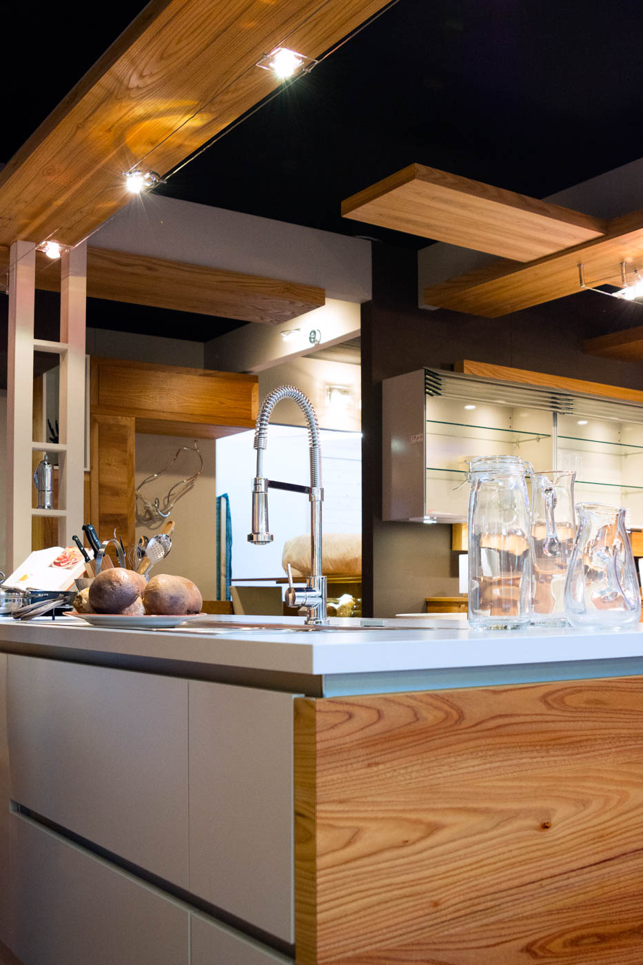 Non servono fronzoli per arredare questo appartamento di 40 mq, solo la linearità della nostra linea Essenza che si snoda in ogni ambiente dell’appartamento: dalla cucina ad isola al soggiorno con pensili in vetro in contrasto, dalla splendida parete di rivestimento che ingloba la stufa al rivestimento della vasca da bagno fino ad arrivare alla zona pranzo con una panca che all’occorrenza diventa scaletta per raggiungere un letto matrimoniale che si movimenta.
