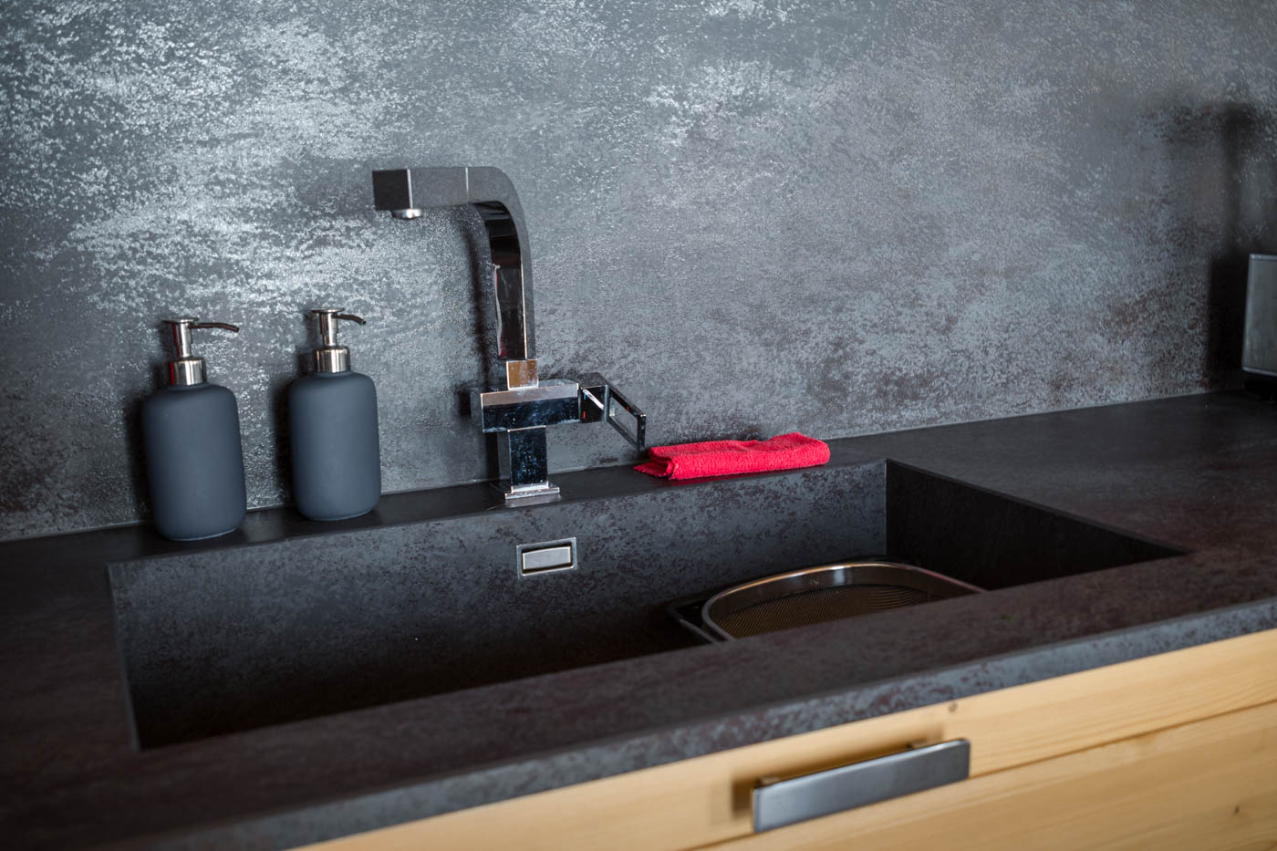 Una cucina estremamente pratica con un piano di lavoro in Laminam, grès porcellanato, per avere il top della funzionalità. Una zona pranzo realizzata su misura per accogliere tanti amici e tutta la famiglia ma soprattutto perché tutti volevano la panca, e così si inserisce meglio nello spazio.